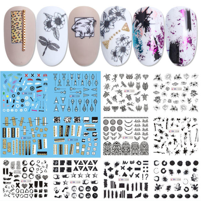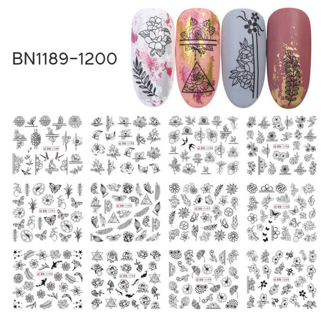 12pcs Nail Art Accessories Watermark Stickers Leopard Print Flowers English Letters Decoration Set Sexy Decals Sliders For Nails